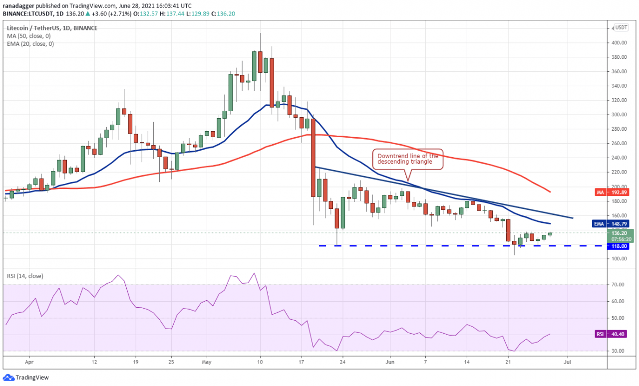 莱特币 (LTC) 在 6 月 26 日从 118 美元的支撑位反弹,但反弹缺乏力量。 这表明多头在当前水平上缺乏积极的购买。
