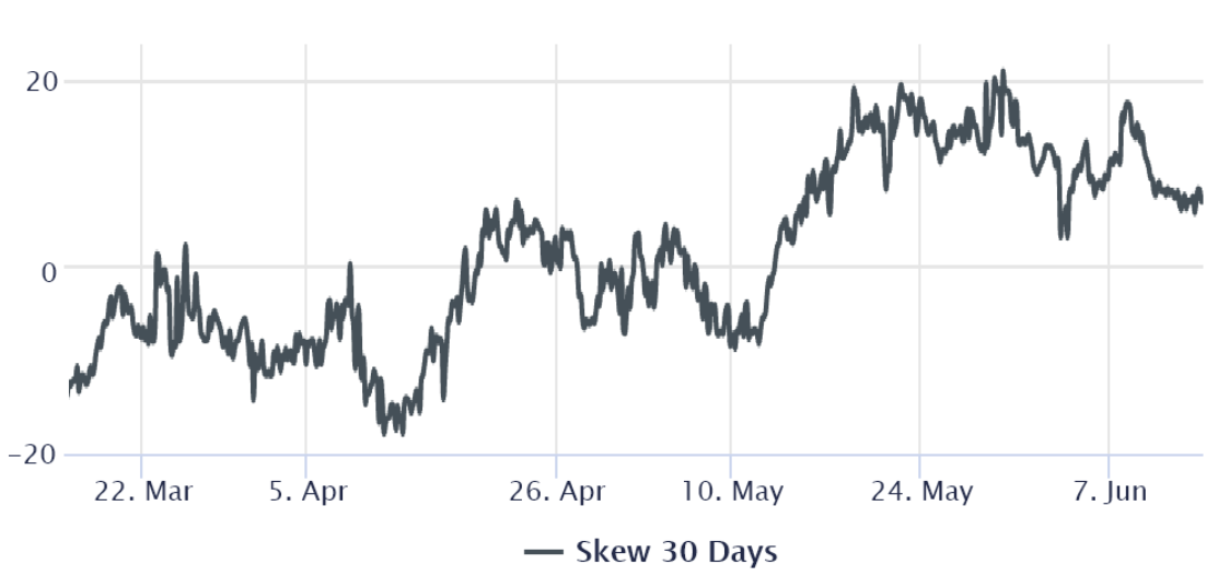 “由于中性至看跌的看跌期权溢价较高,套利柜台和市场标记目前对比特币的价格感到不安。 然而,目前 7% 的正偏斜与 5 月底出现的 20% 夸大的恐惧相去甚远。”