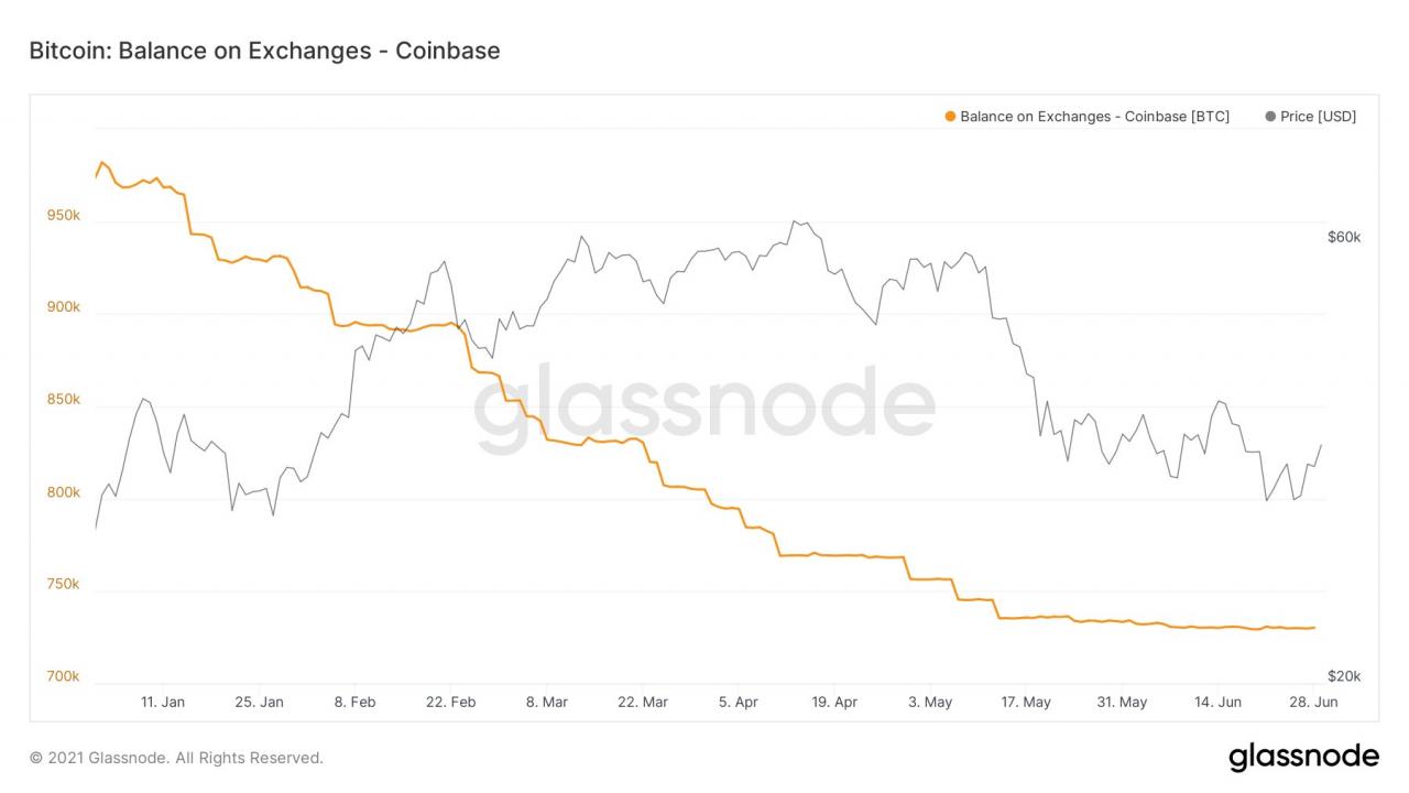 Coinbase 的 BTC 余额在 2021 年连续下跌。这一趋势一直持续到 5 月中旬的价格投降事件,当时提款明显停止。 从那时起,Coinbase 的比特币储备仅出现小幅下跌。