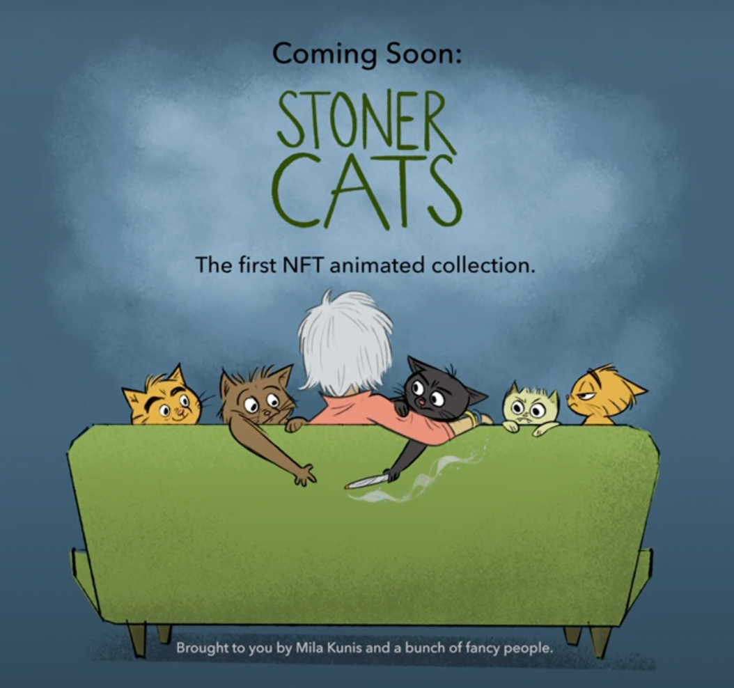 与 CryptoKitties 创始人 Mack Flavelle 和 CryptoPoops NFT 创造者乔纳森霍华德合作,通过他们最近的努力 Big Head Club 和其他人,Kunis 将 Stoner Cats项目描述为允许加密货币用户购买 NFT,其中包含有时喝和吸食大麻的猫的图像——休闲大麻是合法的自 2016 年以来在加利福尼亚州。令牌然后允许他们“观看五分钟长的娱乐节目”。