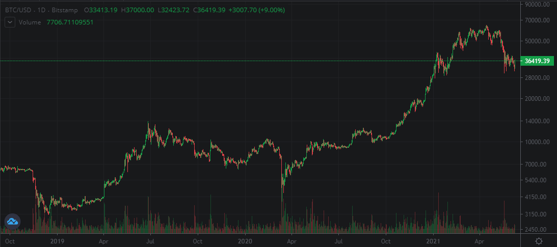 查看比特币的K线走势图,我们可以看到类似的价格模式始于 2020 年末,可能从 11 月开始出现“难以置信”阶段。 1 月初的上涨在外观上与上图的“希望”阶段相似,然后是数月的上涨,4 月创下历史新高。