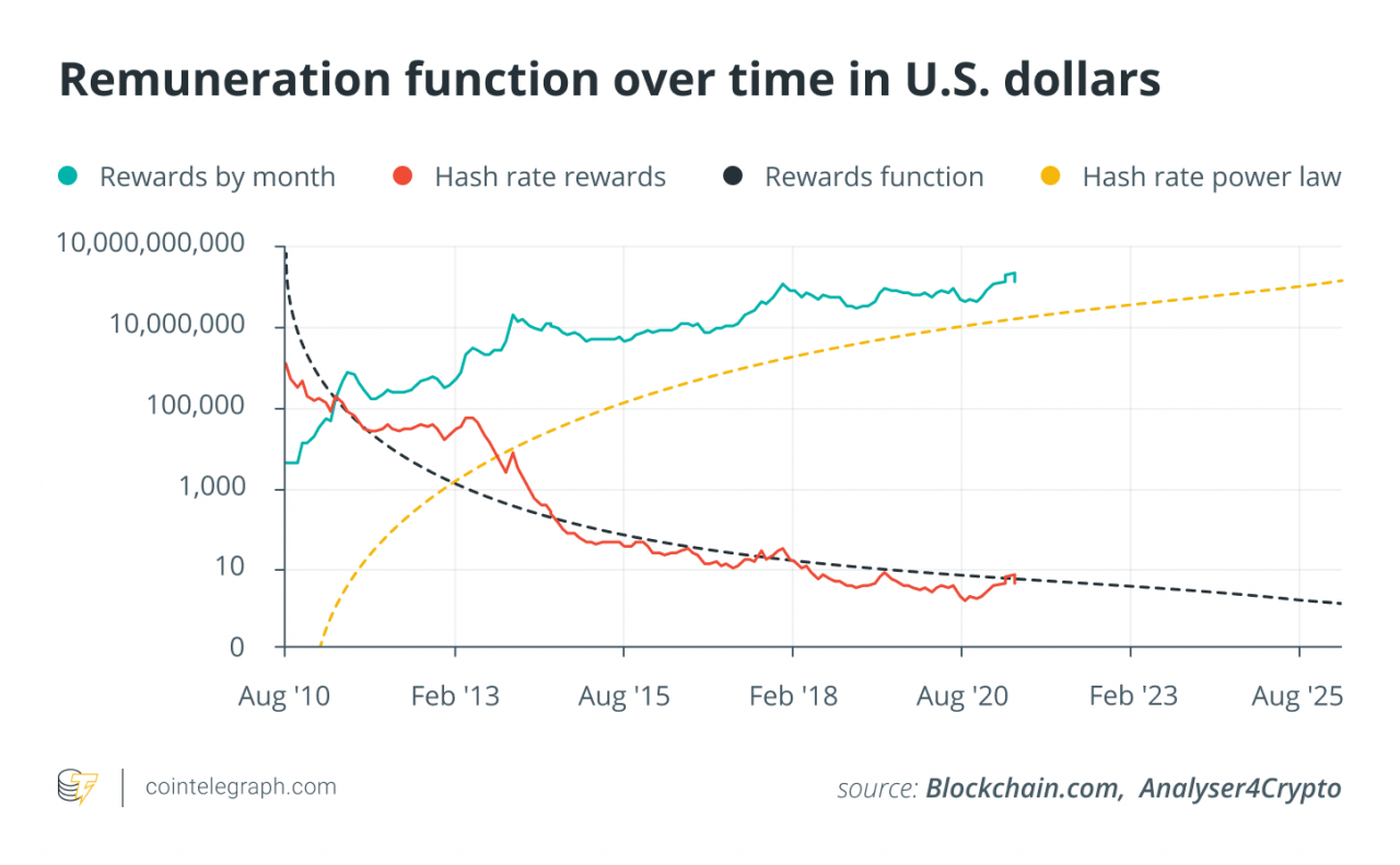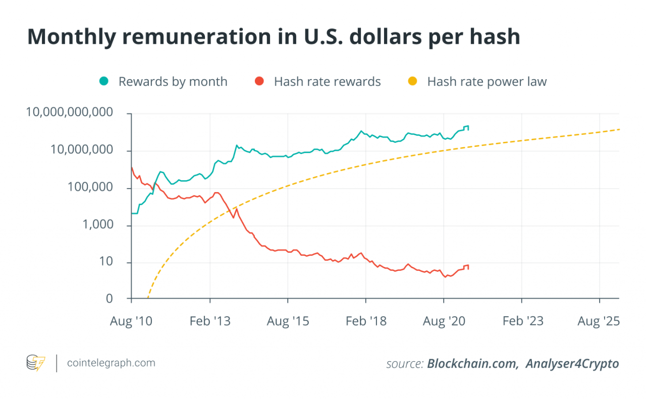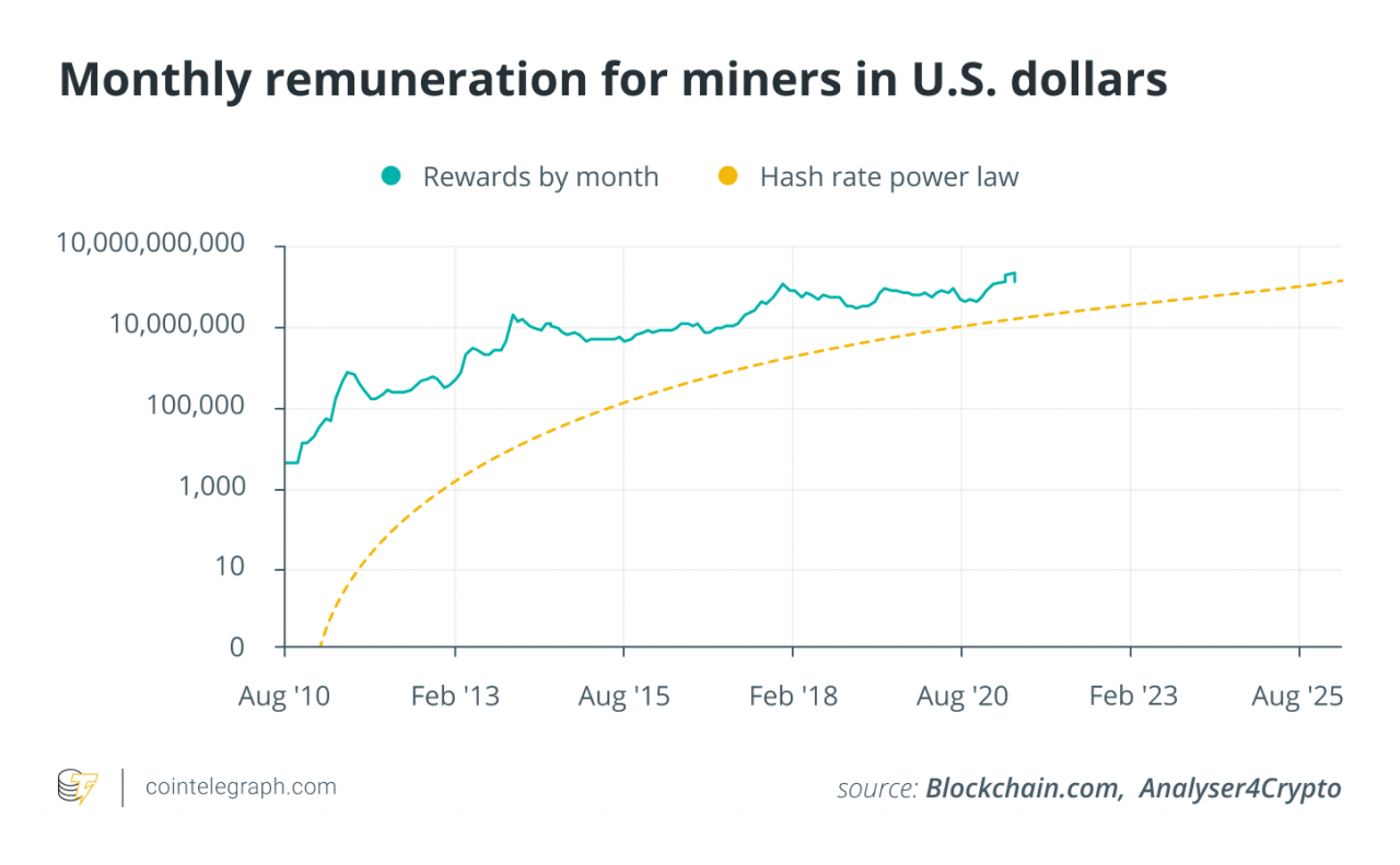 在 2010 年的头几个月,比特币每月向矿工支付大约 10,000 美元。 今天,由于比特币价格的上涨,全球矿工网络每月分配的财富超过 5 亿美元——而且这个价值注定会增长。