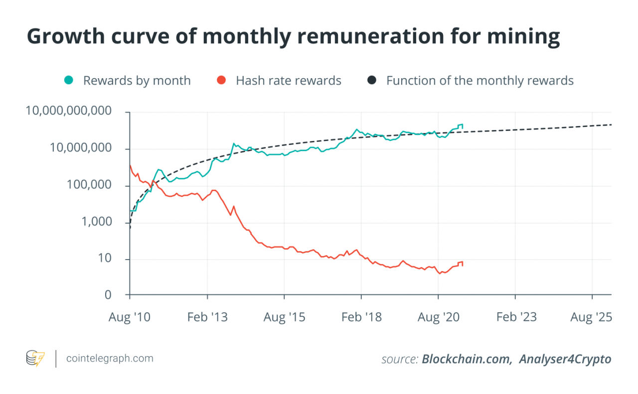 这个数字是巨大的,即使部分与电力消耗相称,但它使我们能够了解这个“社会实验”能够创造财富的产生。 从图中我们可以看出,算力的增长高于月薪的增长。 因此,为了根据哈希率估算比特币的正确价格,首先需要了解每单位哈希的报酬随时间的变化趋势。