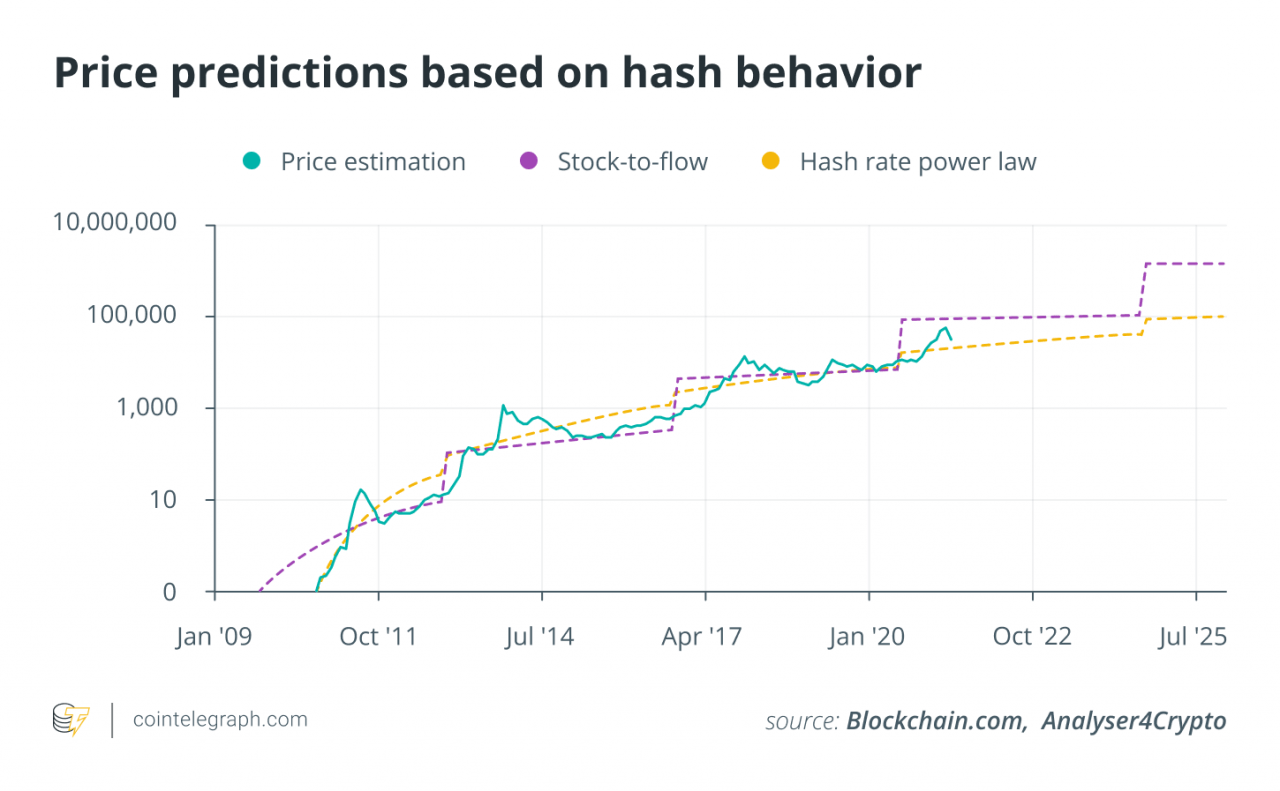 要估计根据此哈希率指标进行修正的比特币价格,必须将此值除以给定月份开采的比特币平均数量。 通过这样做,我们获得了前面描述的股票到流量模型的典型阶梯趋势。