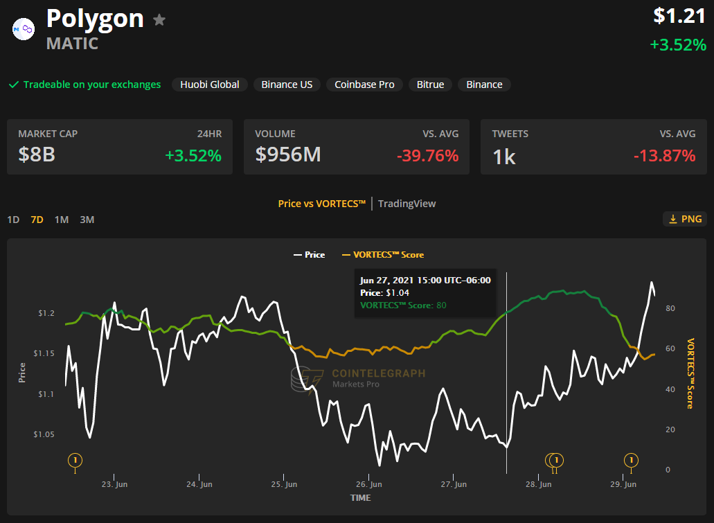 在最近的价格上涨之前,来自 Cointelegraph Markets Pro 的 VORTECS™ 数据于 6 月 27 日开始检测到 MATIC 的看涨前景。