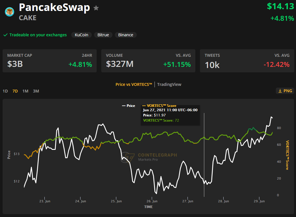 来自 Cointelegraph Markets Pro 的数据也表明 PancakeSwap (CAKE) 的 VORTECS™ 分数看涨,这是一种基于币安智能链的自动化做市商和去中心化交易所。