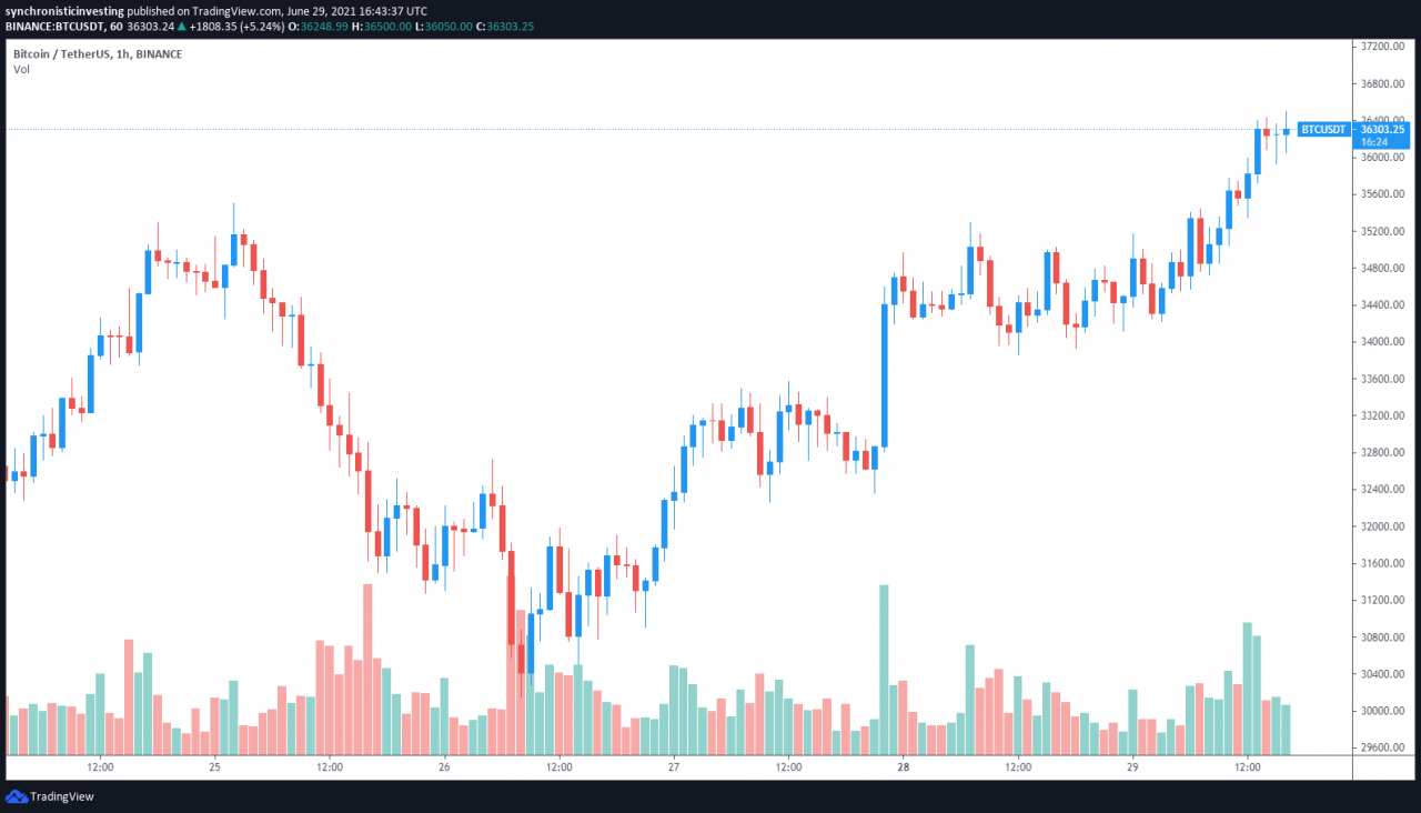 过去两天山寨币市场的强势在很大程度上要归功于比特币的强劲表现,比特币最终突破了 35,000 美元的阻力位,目前交易价格为 36,400 美元。