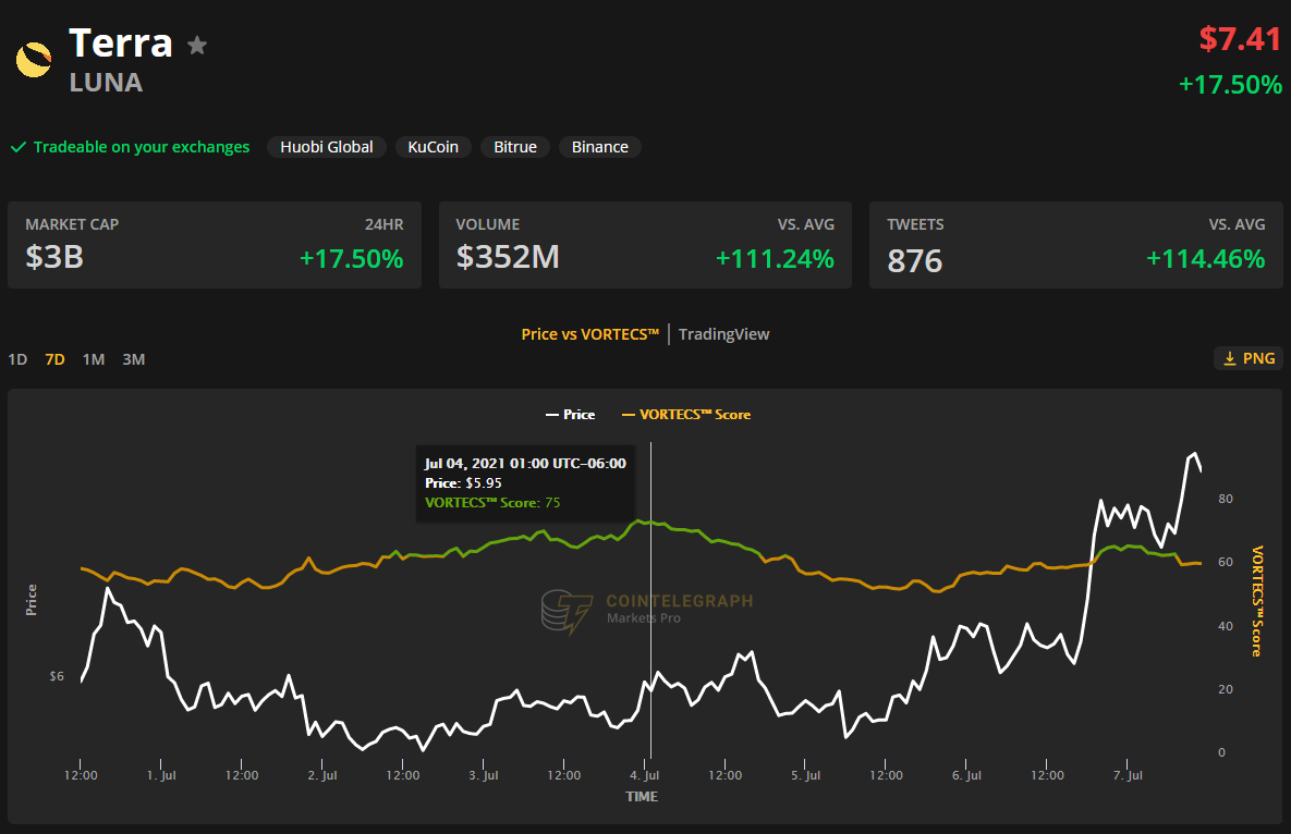 来自 Cointelegraph Markets Pro 的 VORTECS™ 数据于 7 月 3 日开始检测到 LUNA 的看涨前景,这是在近期价格上涨之前。