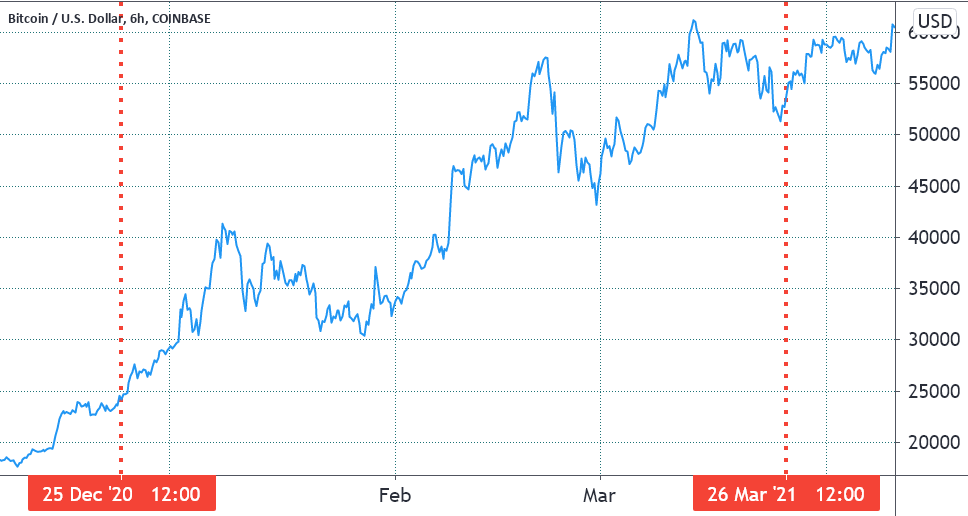 2020 年 12 月和 2021 年 3 月的比特币价格到期。 资料来源:TradingView