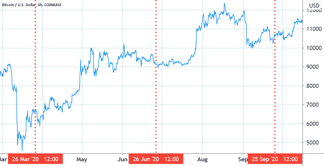 2020 年 3 月、6 月和 9 月的比特币价格到期。 资料来源:TradingView