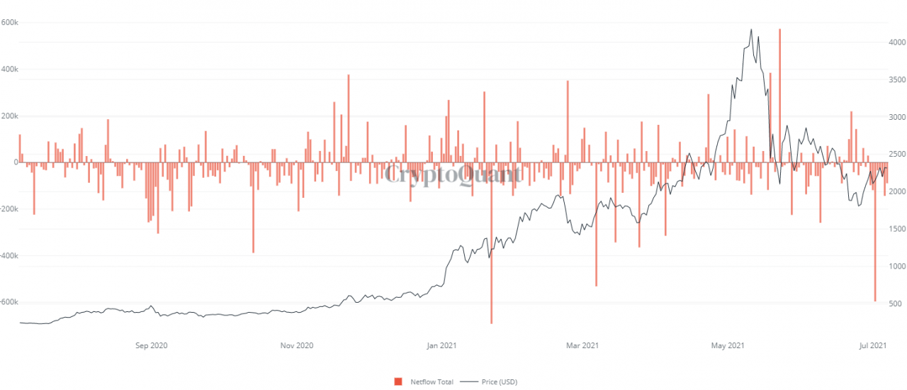CryptoQuant 的数据显示,7 月 1 日出现了自 1 月 21 日以来交易所最大的单日流出以太币,超过 596,000 以太币移除交易所。