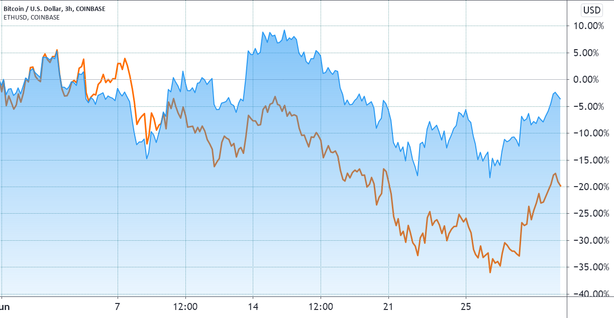 以太(橙色)与比特币(蓝色)的价格。 资料来源:TradingView