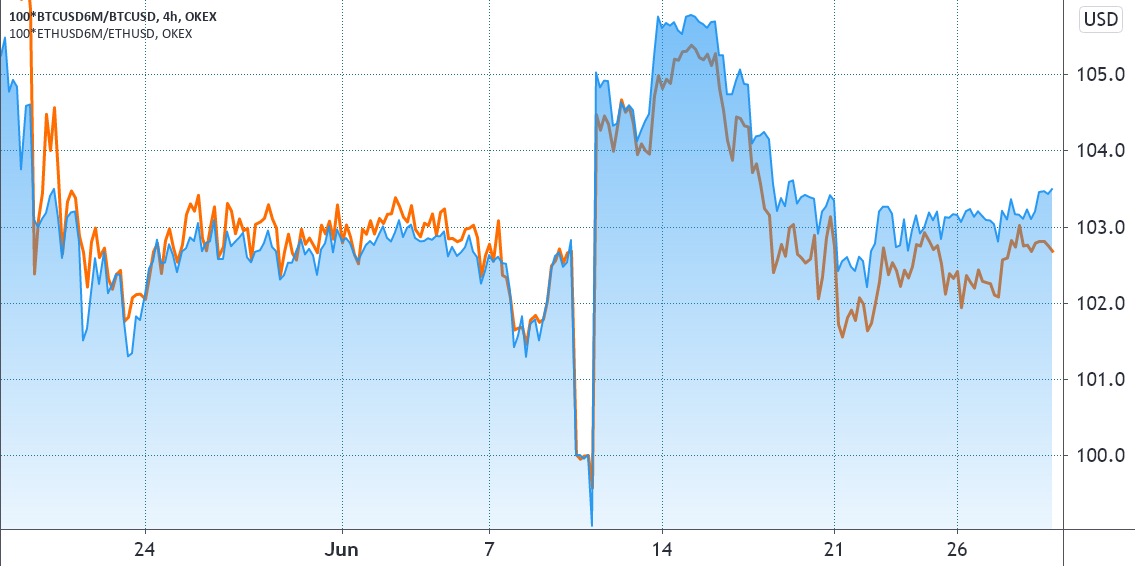 OKEx BTC(蓝色)与 ETH(橙色)12 月期货溢价。 资料来源:TradingView