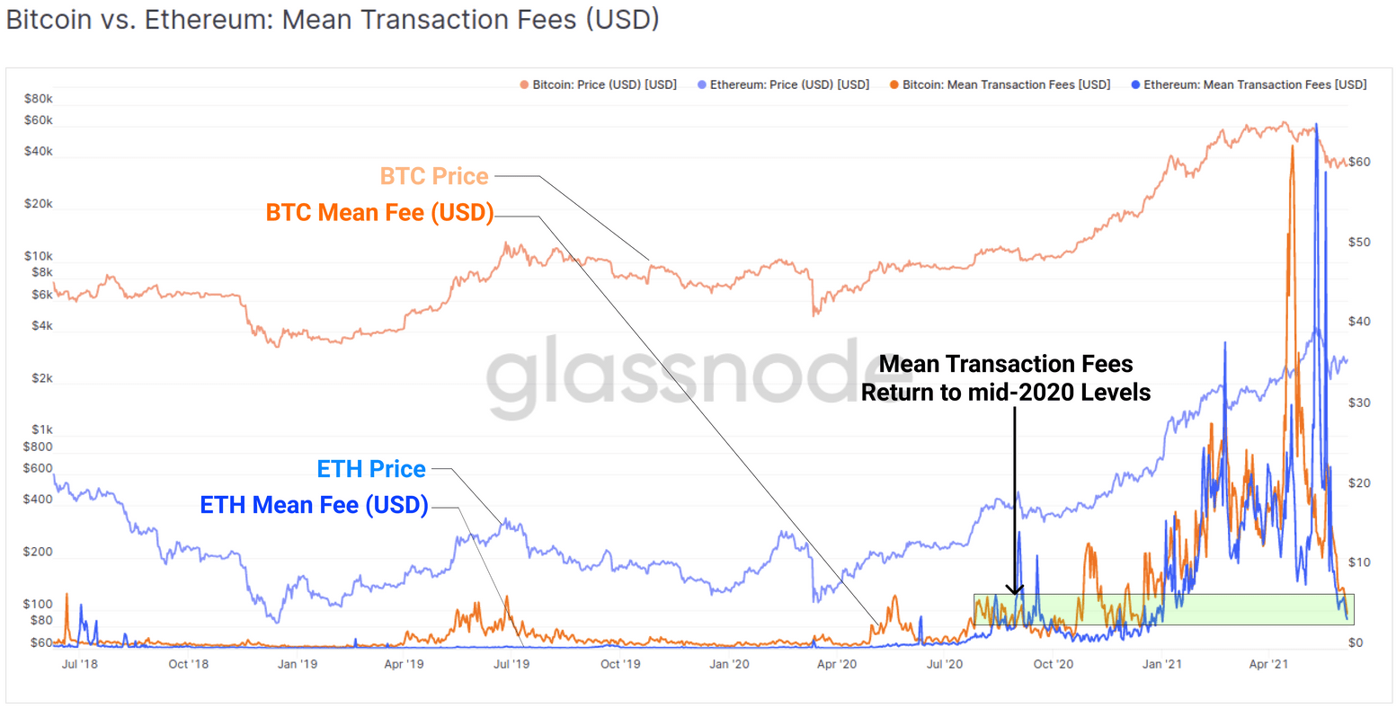 比特币与以太币的平均交易费用。来源:Glassnode