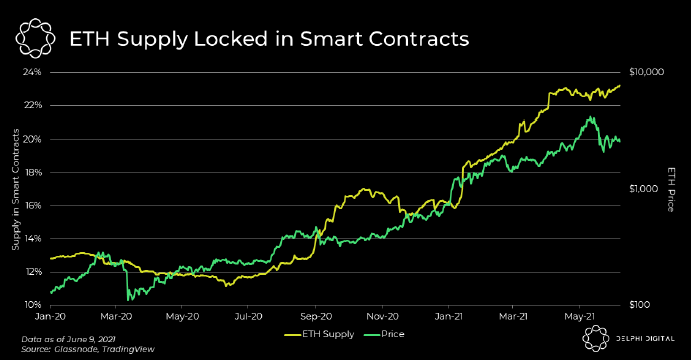 以太币的价格从 6 月 8 日的 2,300 美元低点上涨 14% 至接近 2,630 美元的盘中高点,Delphi Digital 指出,以太币的价格受到以太币流通供应量下跌的支撑,占其供应量的 23%现在被锁定智能合约。
