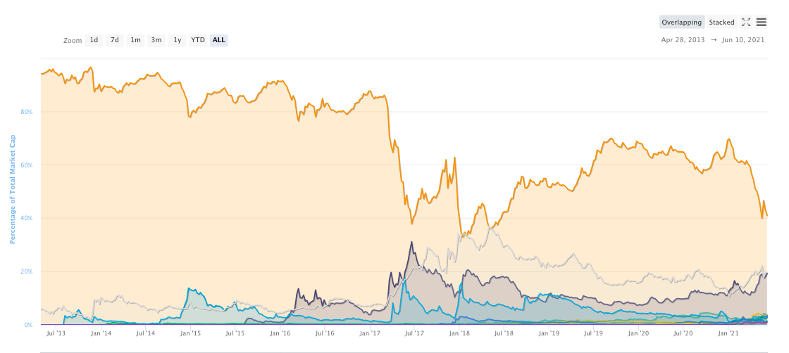 比特币主导地位百分比历史K线走势图。 资料来源:CoinMarketCap