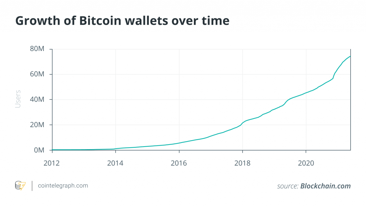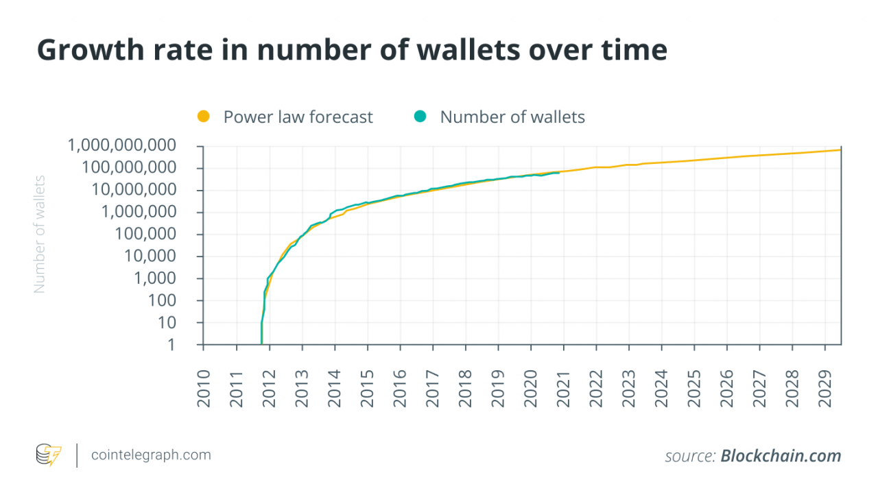 尽管该函数不考虑基于比特币意外增长后可能在 2021 年表现出来的兴趣增加的任何潜在未来增长,但此练习用于估计钱包数量随时间的增长。
