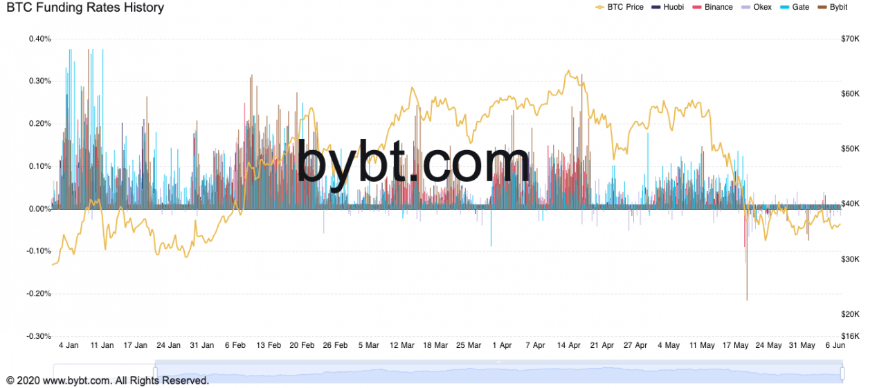 与此同时,在 5 月 19 日的崩盘之后,比特币衍生品市场多头头寸的资金成本基本保持在零以下。 负资金利率导致看跌交易者每八小时支付一次费用。 这种情况鼓励做市商和套利交易台购买反向掉期或永续合约,因为他们同时卸载期货月度合约。