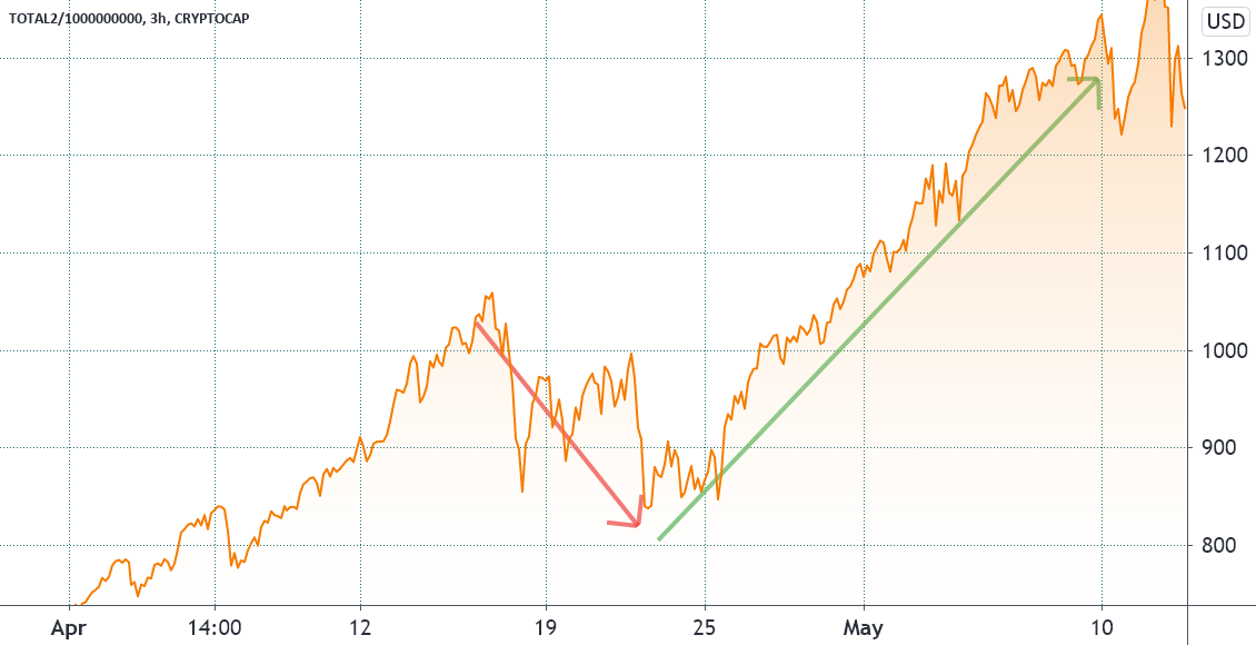 山寨币也出现了类似的趋势,在 4 月 22 日触底至 8500 亿美元,但在 5 月 10 日完全恢复到创纪录的 1.34 万亿美元。不能保证这种模式会重复,但没有比最近的市场本身更好的信息来源。