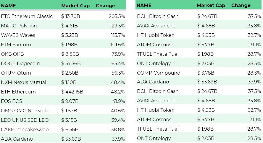 在前 100 名代币中,Ether Classic (ETC)、Polygon (MATIC)、Waves 和 Fantom (FTM) 是明显的赢家。 获胜者要么是扩展解决方案,要么是智能合约平台,而行业领导者以太 (ETH) 的表现也跑赢了市场。