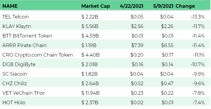 4 月 22 日至 5 月 9 日期间排名前 100 的山寨币表现最差。资料来源:CoinCodex