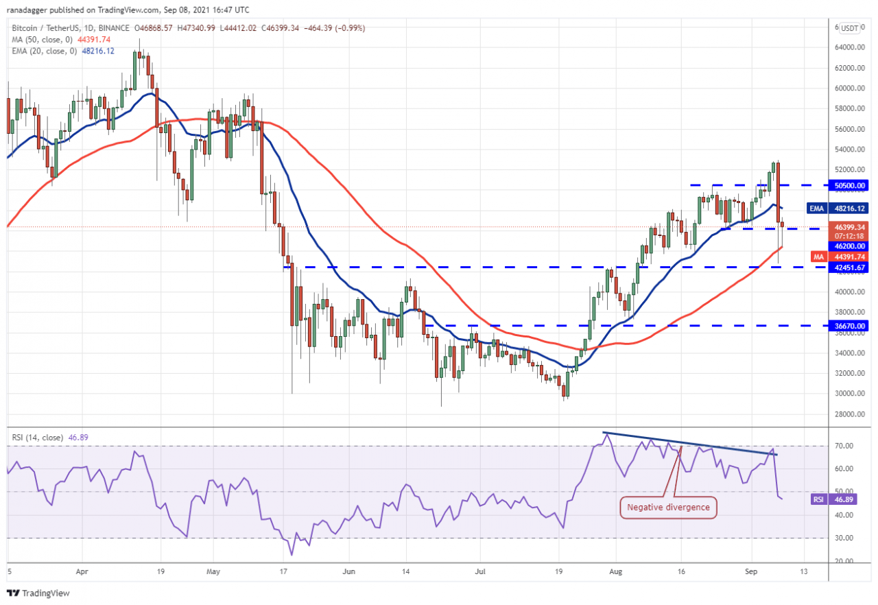 如果该区域保持不变,多头将试图将价格推高至 20 天指数移动平均线(48,216 美元)上方。 如果他们成功,BTC/USDT 对可能会再次升至 52,920 美元,但空头不太可能轻易放弃。