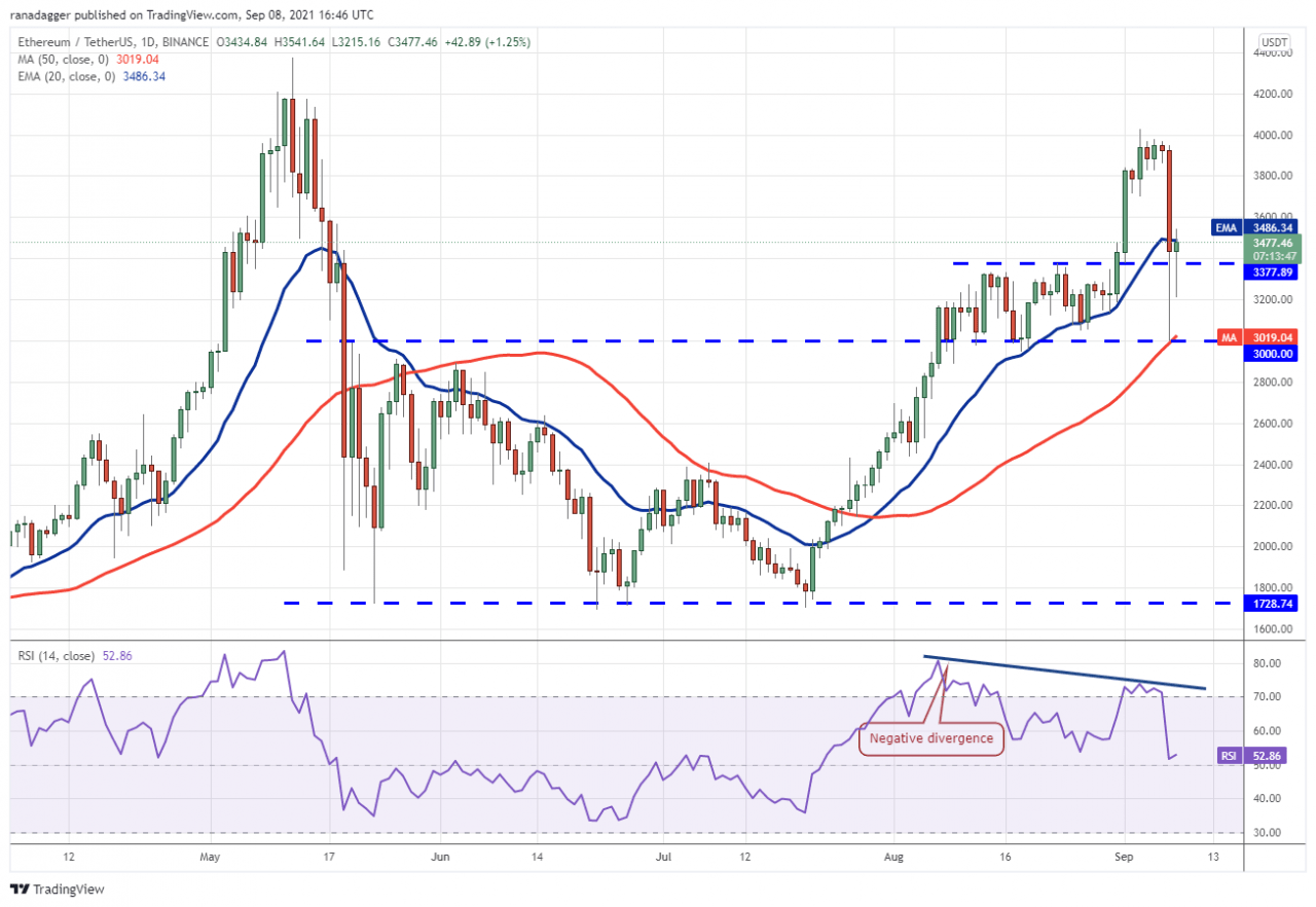 多头未能阻止 20 天均线(3,486 美元)的下跌,导致跌至 3,000 美元的关键支撑位。 从当天烛台的长尾可以看出,这一水平吸引了强劲的买盘,ETH/USDT 货币对出现了强劲的复苏。