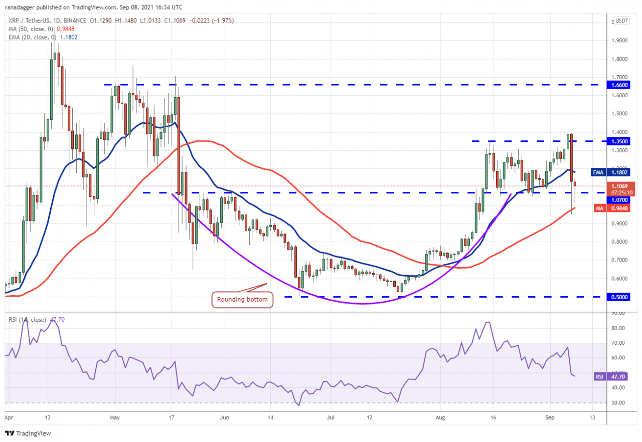 9 月 7 日的长尾和今天的烛台表明多头正试图捍卫 50 日均线。 如果价格维持在 1.05 美元以上,买家将尝试将 XRP/USDT 对推高至 20 日均线(1.18 美元)上方。