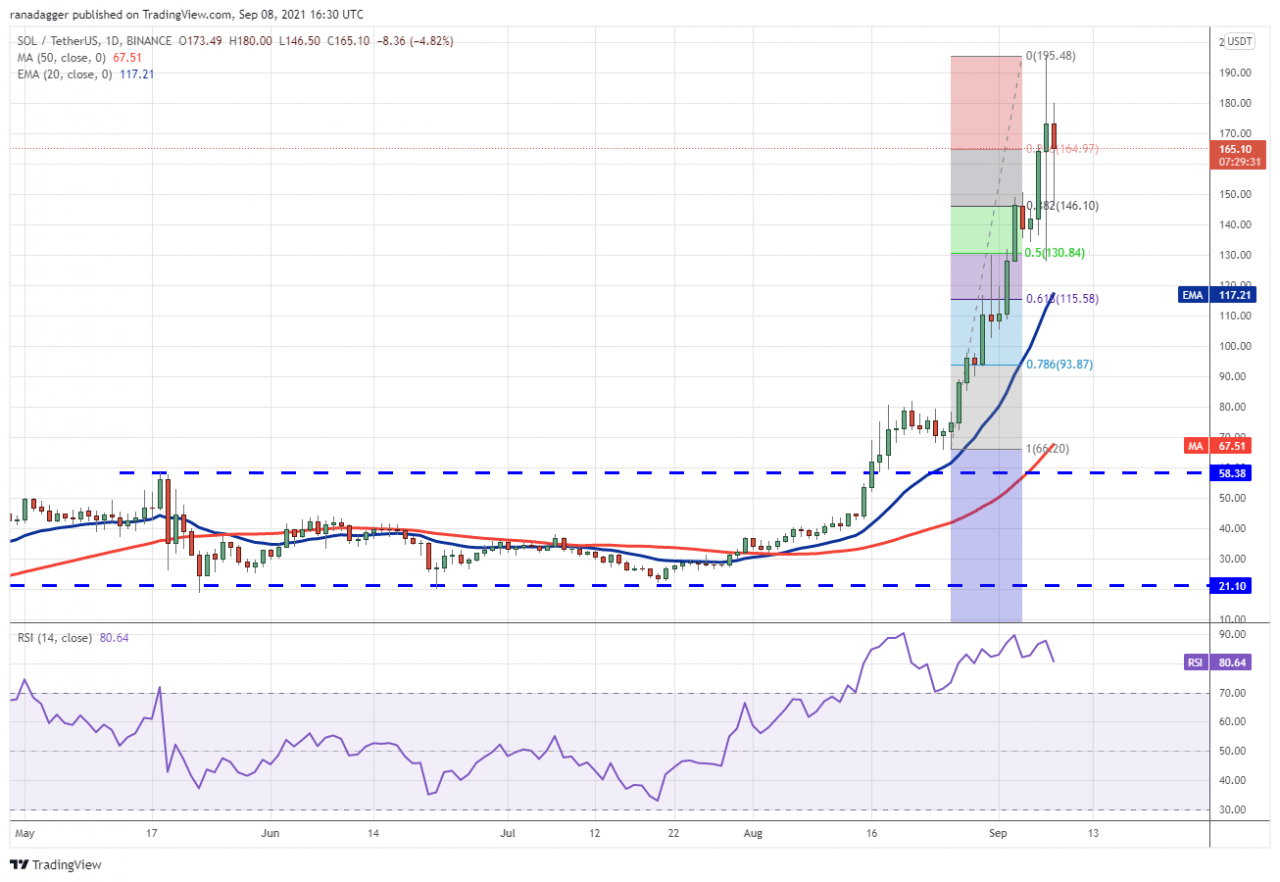 Solana (SOL) 在 9 月 8 日飙升至历史新高 198 美元,但更高的水平吸引了利润预订。 空头拉低了价格,但当天烛台上的长尾显示在 50% 斐波那契回撤位 130.84 美元附近有强劲买盘。