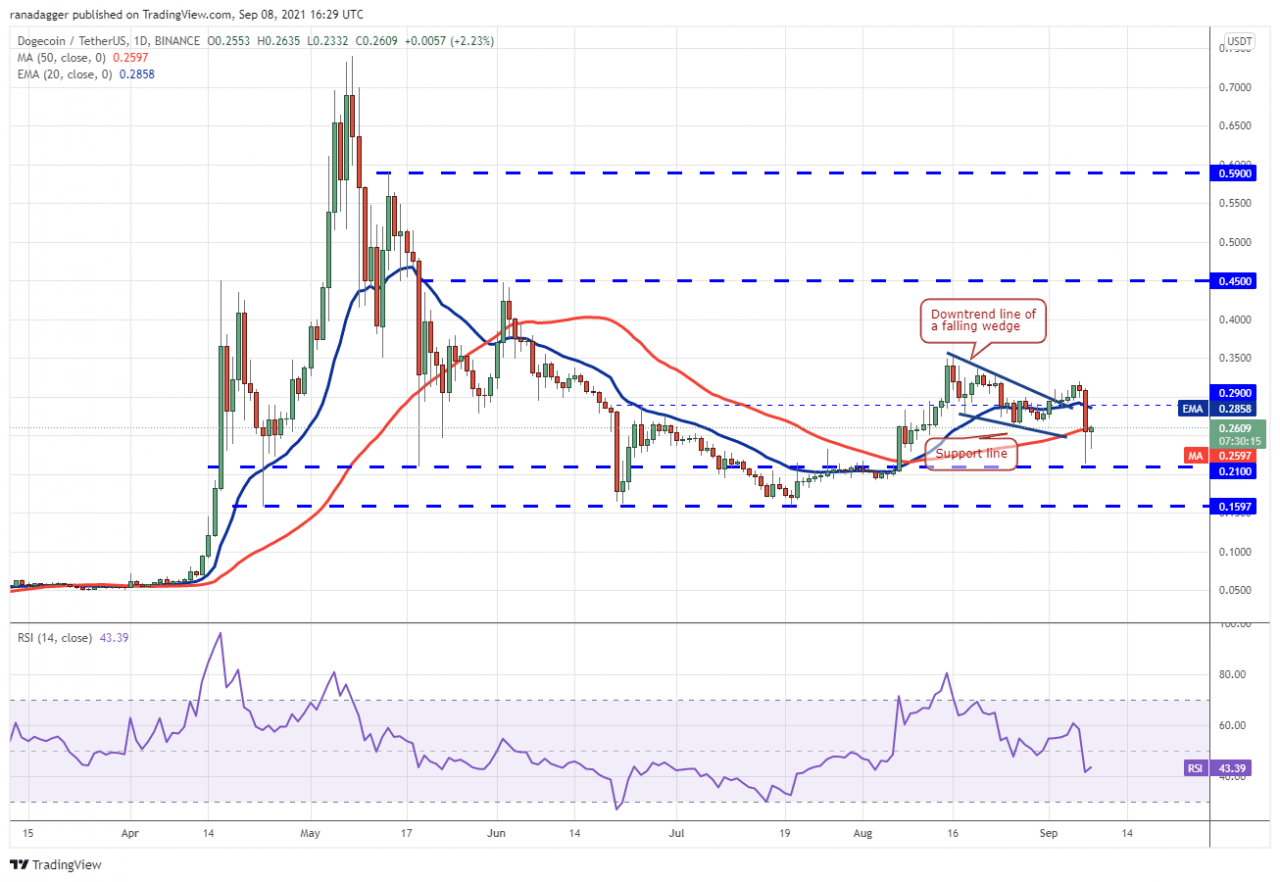 狗狗币(DOGE)在突破下跌楔形模式后未能获得动力。 价格在 9 月 7 日跌破两条移动平均线,表明交易商抛售强劲。