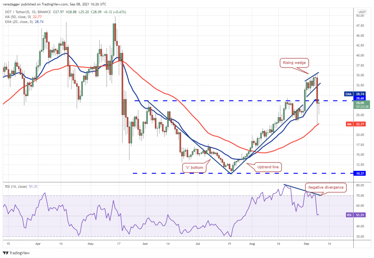 Polkadot (DOT) 在 9 月 7 日跌破上涨的楔形形态。激进的抛售将价格拉低至突破水平 28.60 美元以下,导致跌至 50 日均线(22.77 美元)。