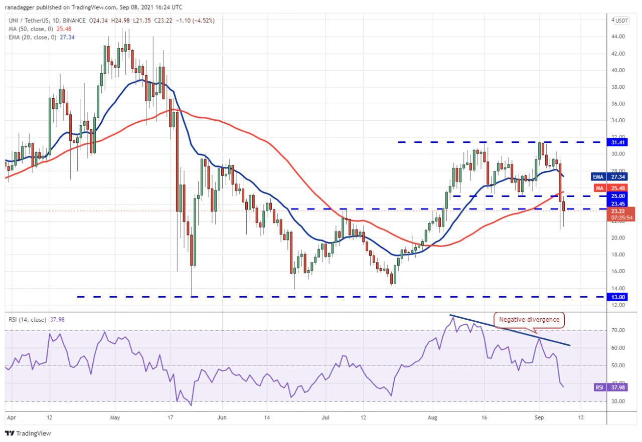 Uniswap (UNI) 在 25 美元至 31.41 美元之间的区间波动在 9 月 7 日解决了下行。多头试图进行反弹并将价格推回到今天的 25 美元上方,但失败了。