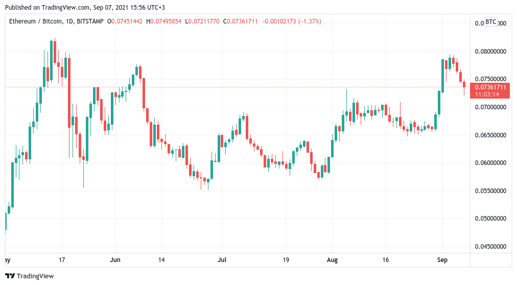 ETH/BTC 1 天蜡烛图 (Bitstamp)。 资料来源:TradingView