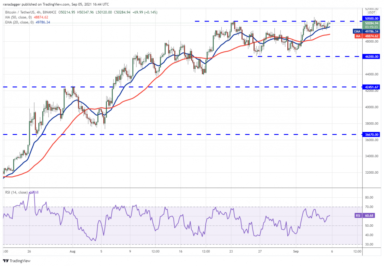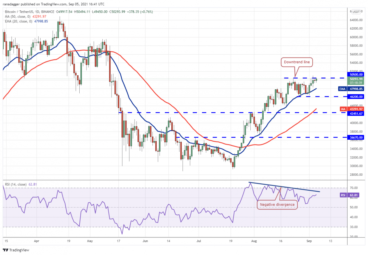 价格一直在 20-EMA 和上方区域之间交易。 范围的收紧很可能很快就会导致强劲的突破。 如果买家将价格推高至 51,000 美元以上,则看涨势头可能会回升,表明上涨趋势的恢复。