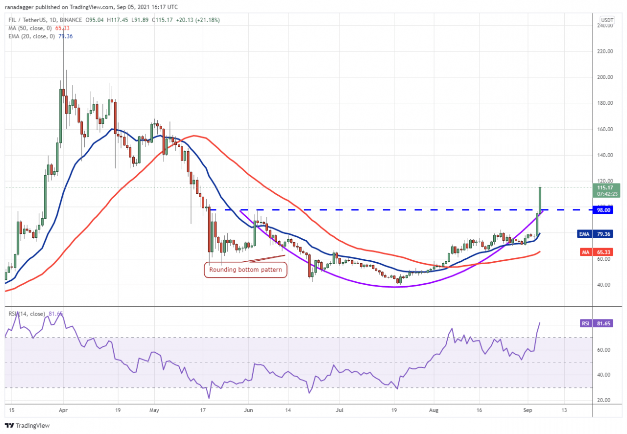 Filecoin 的 FIL 代币今天突破了上方阻力位 98 美元。 这完成了一个圆底形态,表明新的上涨趋势的开始。 底部形态的模式目标为 156 美元。