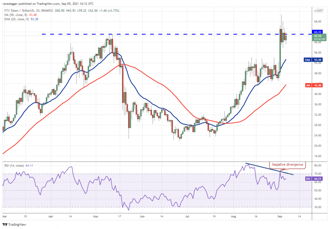 FTX 代币 (FTT) 在 9 月 1 日突破了之前的历史高点 63.13 美元,随后在 9 月 2 日创下历史新高 70.72 美元。多头未能将价格维持在突破水平 63.13 美元上方。
