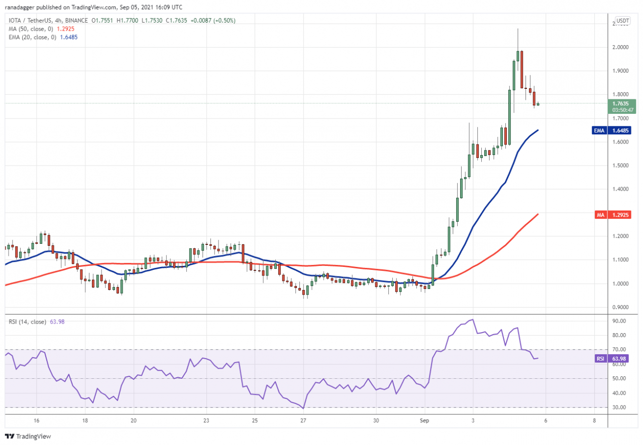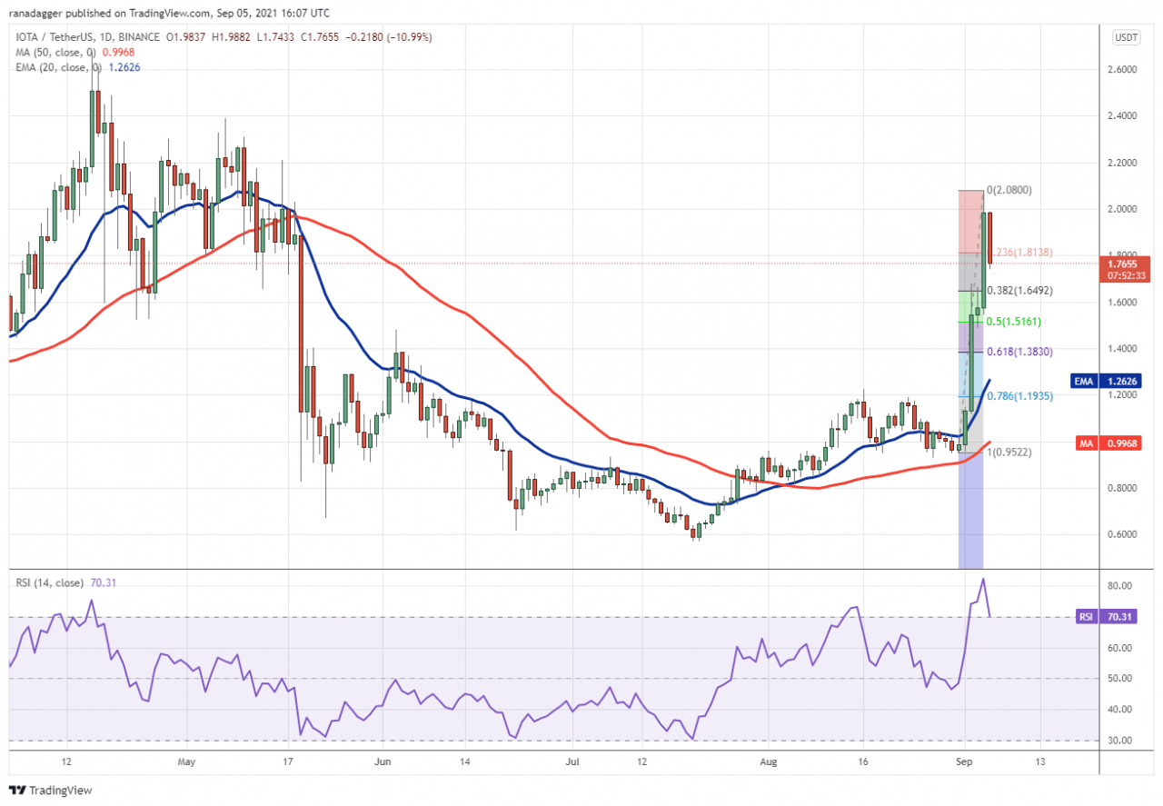 IOTA (MIOTA) 从 9 月 1 日的 0.96 美元大幅上涨至 9 月 4 日的 2.08 美元。这一上涨将 RSI 推高至 82 以上,表明短期内涨势过度。