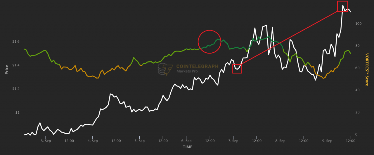 如上图所示,该资产的 VORTECS™ 线在 9 月 6 日变为深绿色(对应于高于 80 的值),而价格为 1.30 美元。 到那时,该资产已经取得了可观的收益,因此交易员可能不确定现在是否仍然是投资山寨币的好时机。