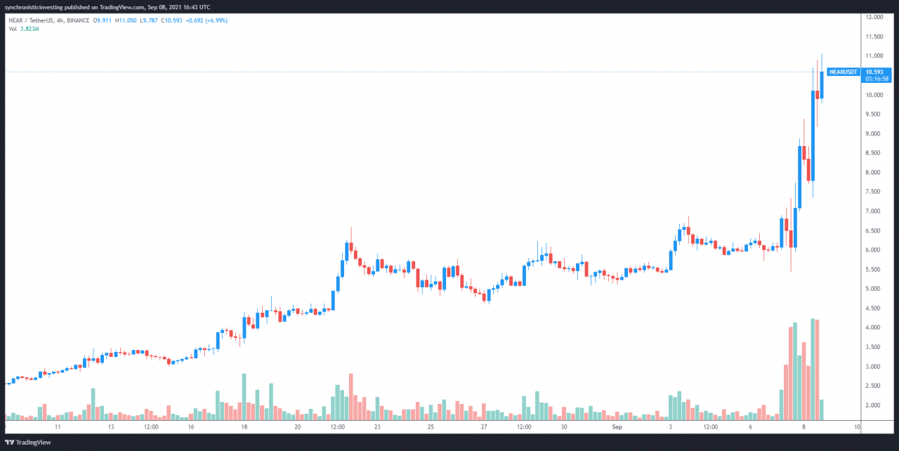 Cointelegraph Markets Pro 和 TradingView 的数据显示,在 9 月 7 日跌至 5.44 美元的低点后,NEAR 的价格在 9 月 8 日飙升 100% 至历史新高 10.79 美元,其 24 小时交易量飙升 260% 至创纪录的 22.7 亿美元。