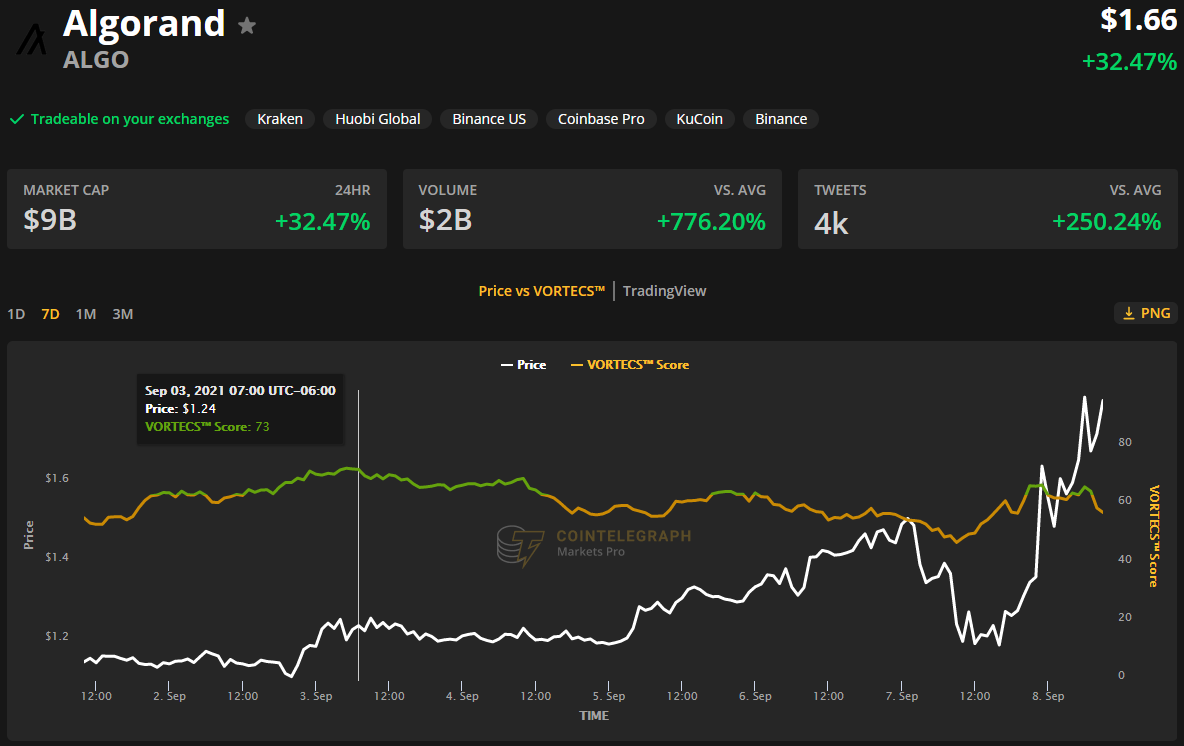 来自 Cointelegraph Markets Pro 的 VORTECS™ 数据于 9 月 3 日开始检测到 ALGO 的看涨前景,在最近的价格上涨之前。