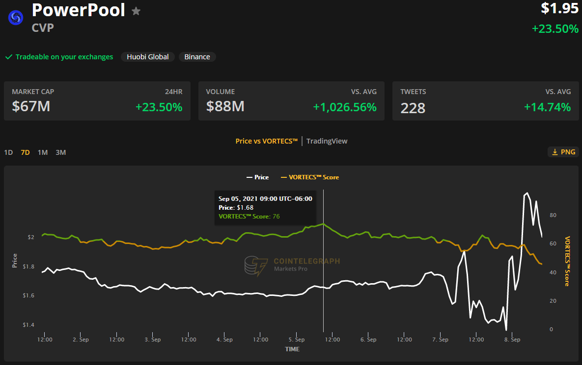 如上图所示,CVP 的 VORTECS™ 分数于 9 月 4 日开始回升,并于 9 月 5 日攀升至 76 的高位,大约在第二天价格上涨 98% 之前的 61 小时。