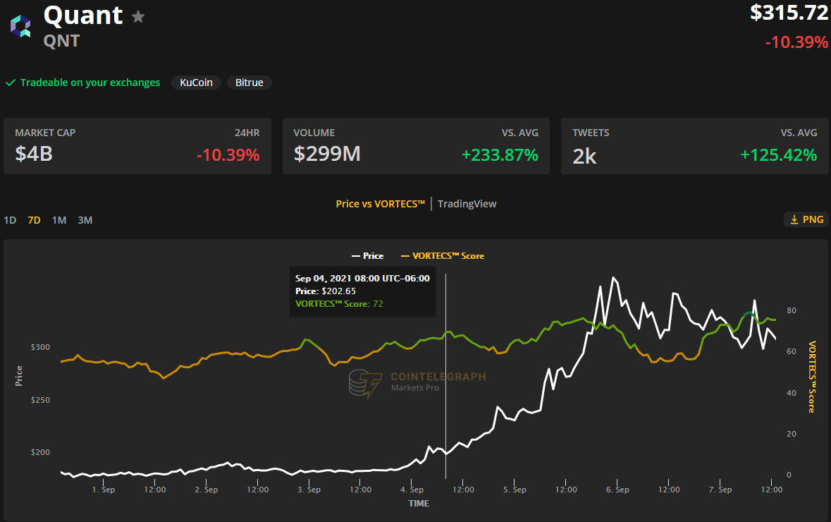 Cointelegraph Markets Pro 和 TradingView 的数据显示,自 9 月 1 日触及 178 美元的低点以来,QNT 的价格在 9 月 6 日飙升 117% 至历史新高 387 美元,其 24 小时交易量飙升至创纪录的 7.4 亿美元。