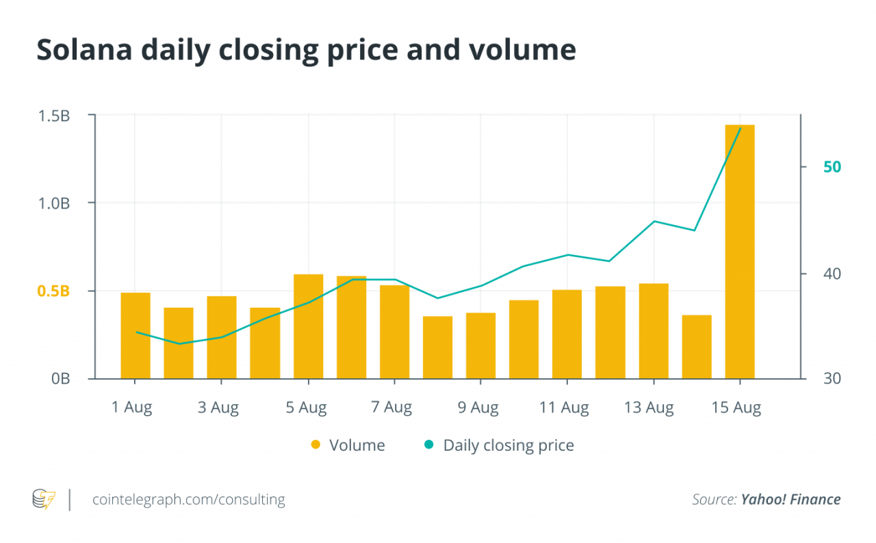 一个名为 Degenerate Ape Academy 的新 NFT项目成为对其可扩展性的测试,因为整个 10,000 只猿的集合在短短八分钟内售罄。 这导致 SOL 价格从一天前的 44.11 美元飙升至 8 月 15 日的 53.70 美元。