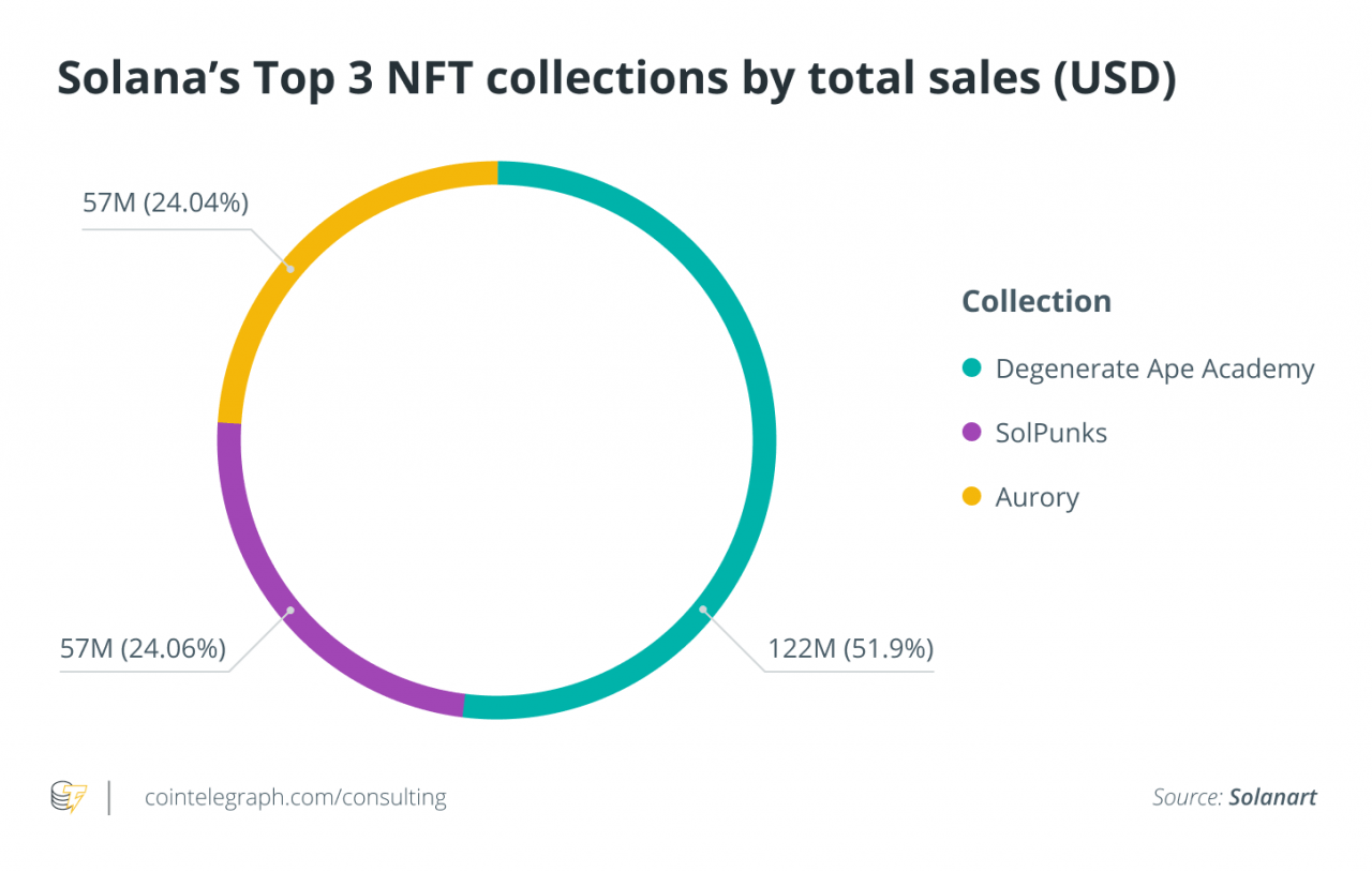 Solana NFT 市场 Solanart 跟踪上架的 NFT 集合的销售情况,表明 Degenerate Ape Academy NFT 是 Solana NFT 销售的主导力量。 该系列已经增持了 765,000 个 SOL 代币,按当前价格计算,价值约为 1.22 亿美元。