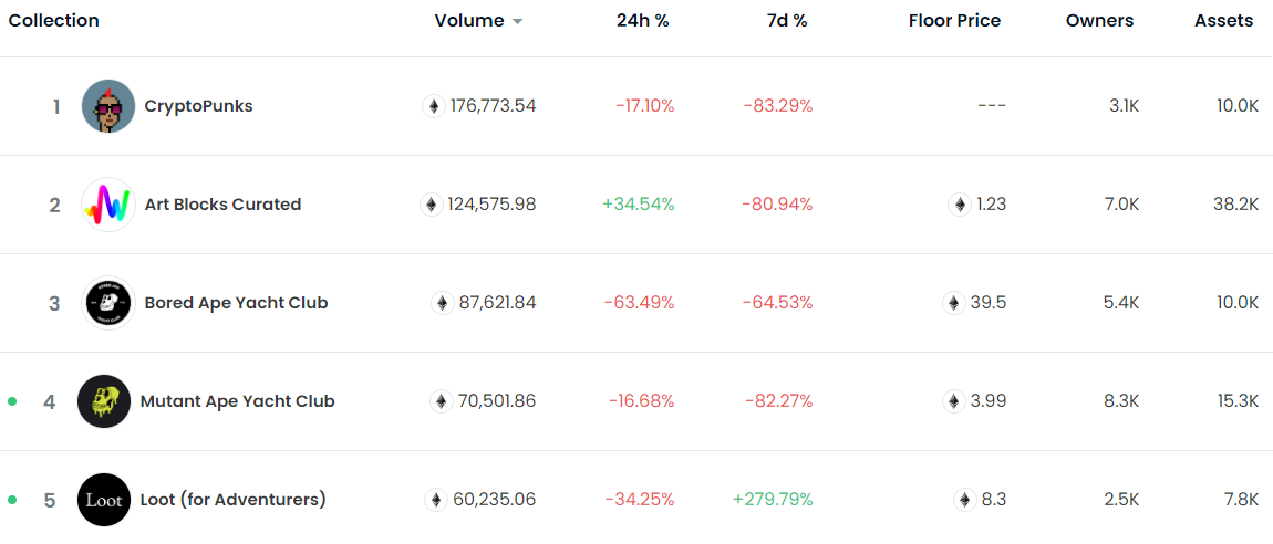 交易量的下跌反映在 OpenSea 上交易的前五个 NFT项目的数据中,所有项目都出现了显着下跌。 Loot 是一个例外,但该项目是一个相对较新的项目,上周还为持有者进行了 70,000 美元的空投。