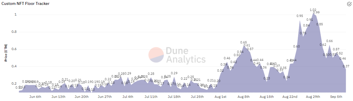 NFT 的底价也大幅下跌,Dune Analytics 的数据显示,在其峰值时,底价为 1.02 以太,但由于市场更广泛的回调和对 NFT 的兴趣暂时下跌,此后已降至 0.37 以太。