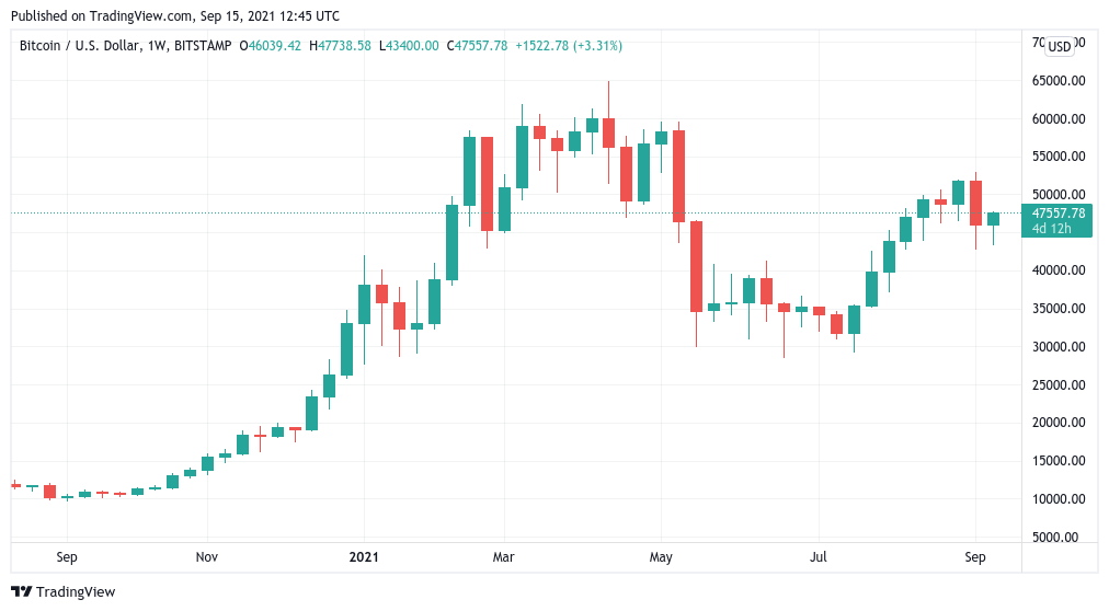 BTC/USD 1 周蜡烛图(Bitstamp)。 资料来源:TradingView