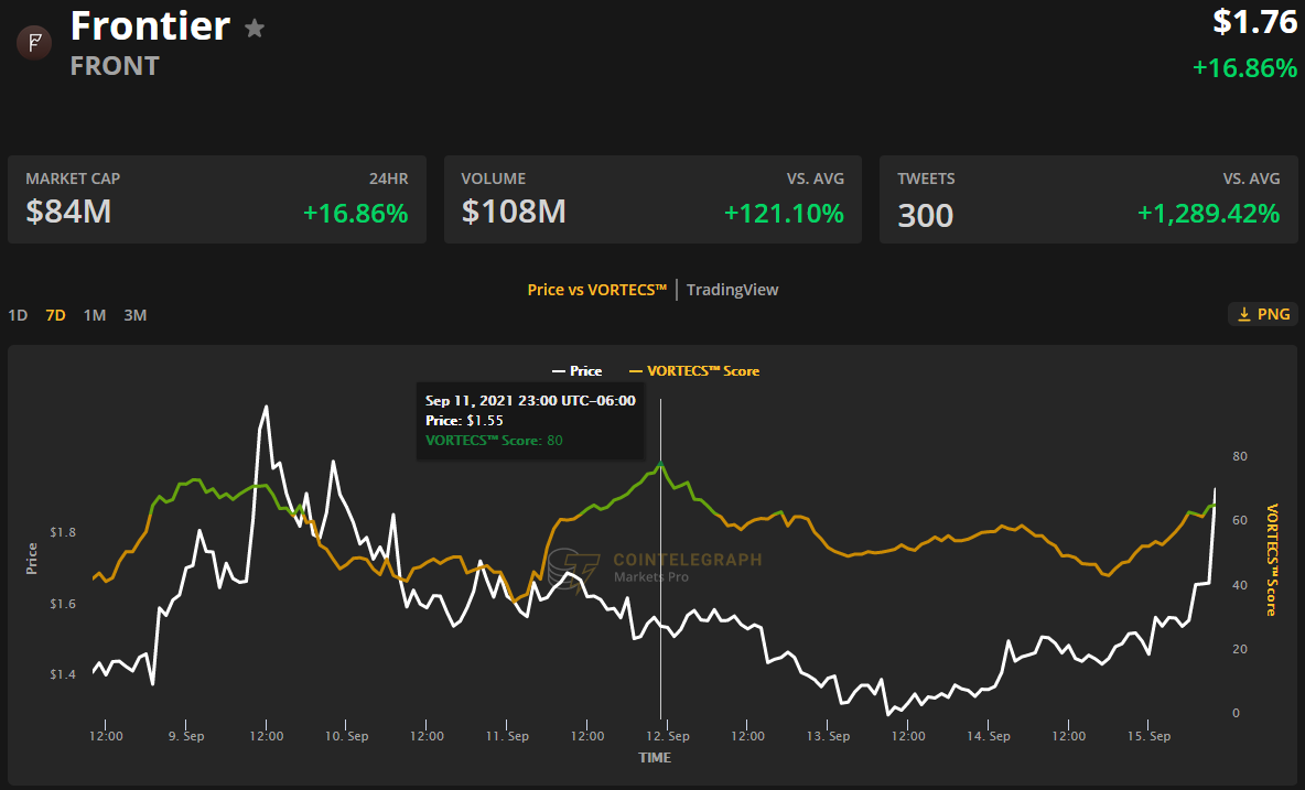 如上图所示,FRONT 的 VORTECS™ 评分在 9 月 11 日变为绿色,并在 34 小时左右攀升至 80 的高位,之后其价格在接下来的两天内上涨了 66%。