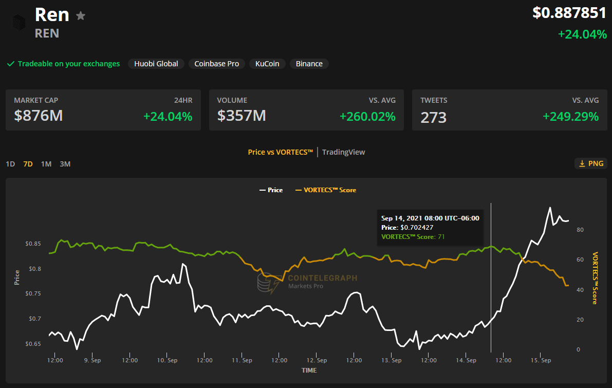在最近的价格上涨之前,来自 Cointelegraph Markets Pro 的 VORTECS™ 数据在 9 月 14 日开始检测到 Ren 的看涨前景。