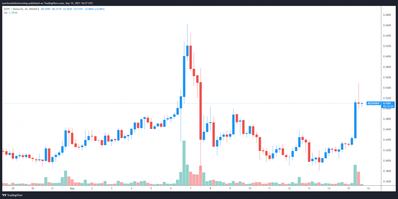 Cointelegraph Markets Pro 和 TradingView 的数据显示,在 9 月 13 日触及 0.38 美元的低点后,KEEP 的价格在 9 月 15 日上涨 45% 至盘中高点 0.55 美元,其 24 小时交易量飙升 250% 至 8000 万美元.
